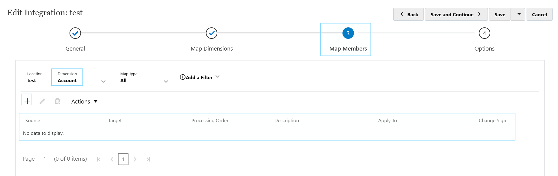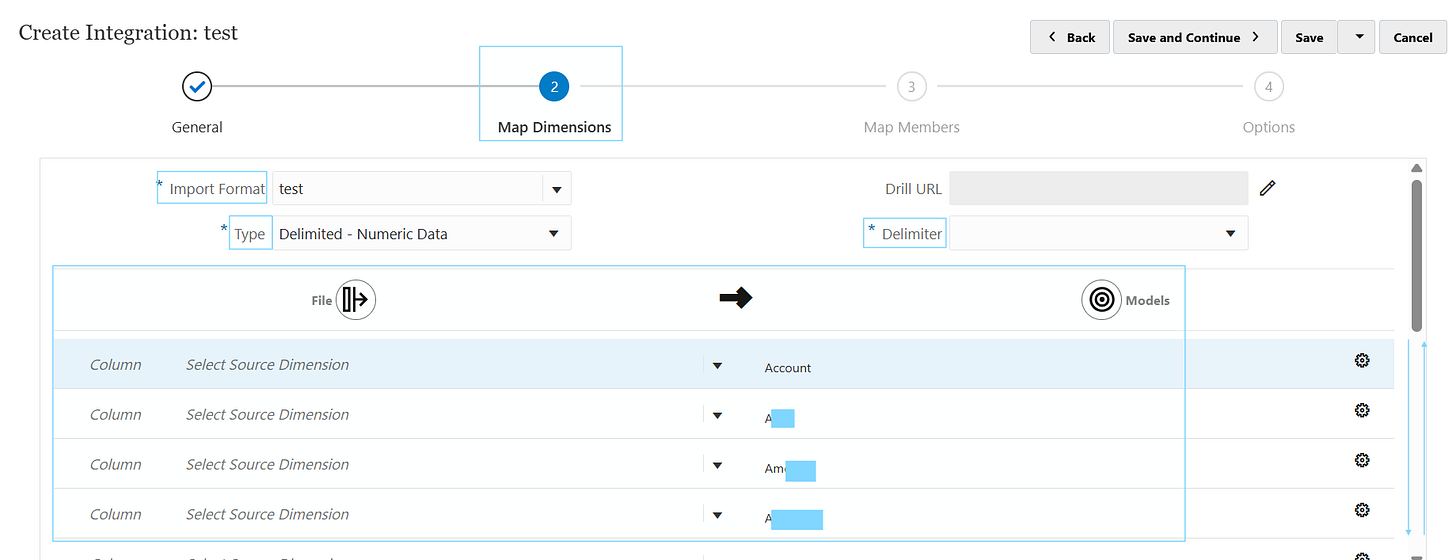 e.g. column 3 of the file called Account, maps to the Account dimension. So, Column = 3, Select Source Dimension = “Account” and the target dimension = Account.